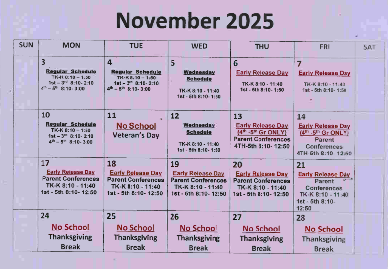 Dear Families, Please take note of the important schedule changes for  November 2025: No School