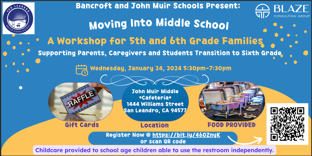 Hello McKinley Families , We invite all SLUSD families to attend Moving into Middle School for incoming 5th graders and current 6th graders families for Bancroft and John Muir Middle Schools. Date:Â Wednesday, January 24, 2025/ 5:30-7:30pm L
